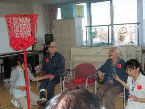 床に落ちた玉を職員が拾って、ご利用者様の膝に乗せながらとんでくる玉を避けて……、なんて器用なことはできず、頭や背中など体のいたるところに入りそこなった玉がビシバシ当たって職員はアザだらけ(涙)