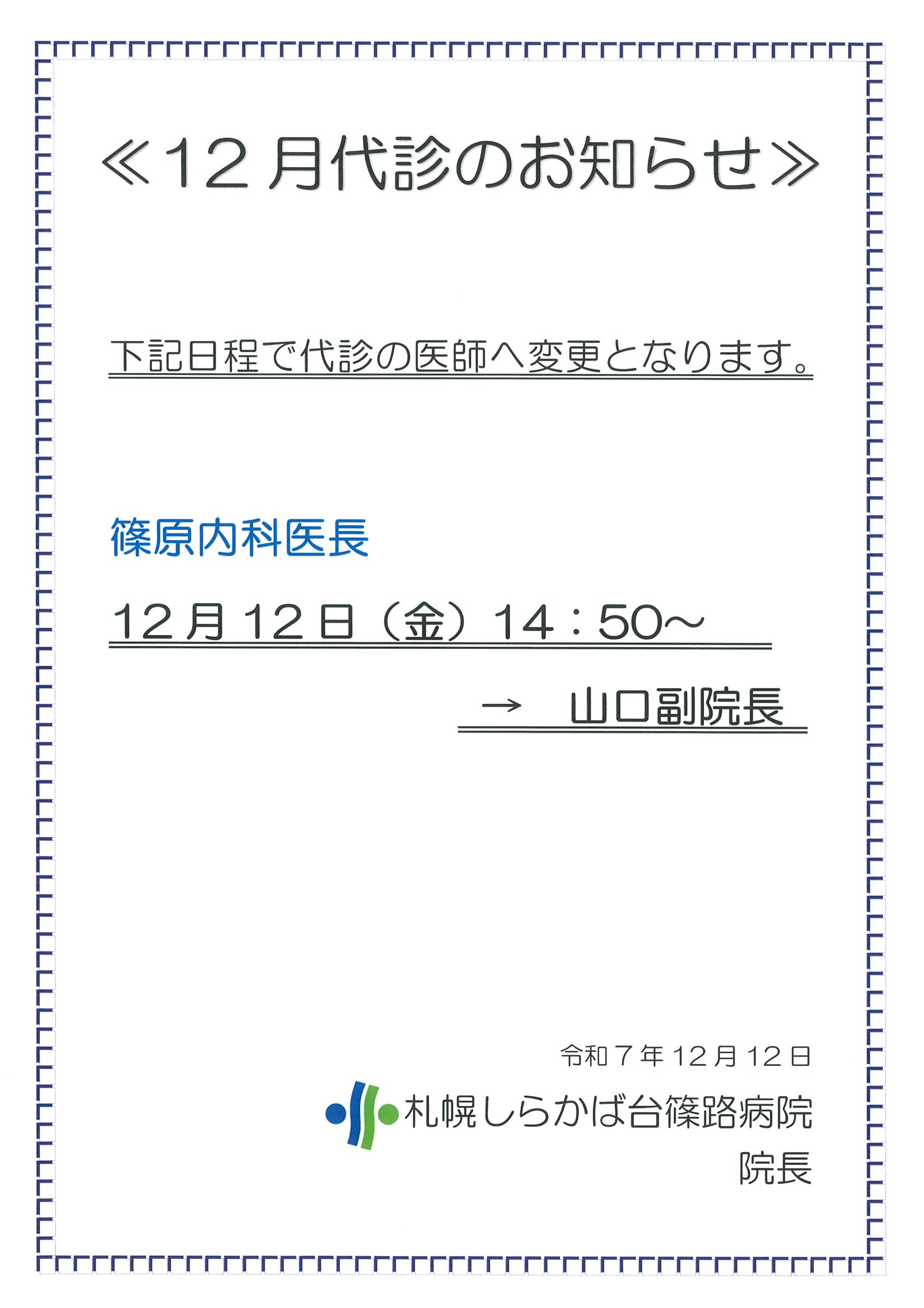 HOME  >  おしらせ   >  2025年12月 代診のお知らせ No.3