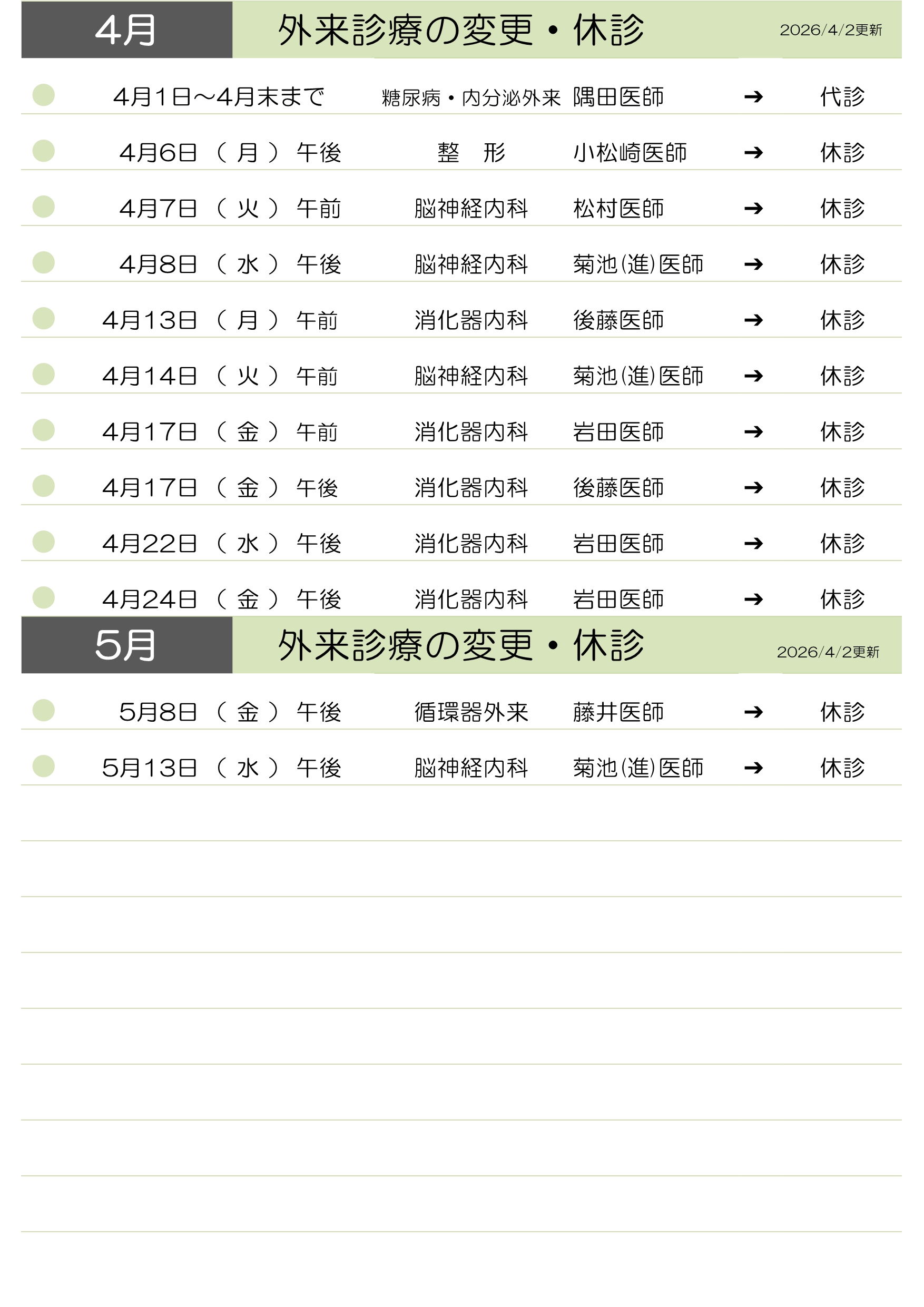 > 【4月・5月】外来診察の変更・休診のお知らせ